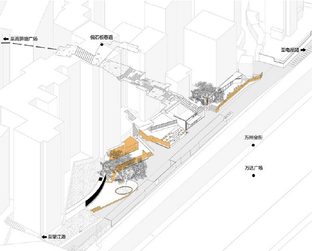 项目设计的具体方法是运用景观背景墙来连接场所间的记忆,以点状商业来代替片状底商模式,增加场地功能,激活空间日常生活,为儿童提供安全的活动场所。