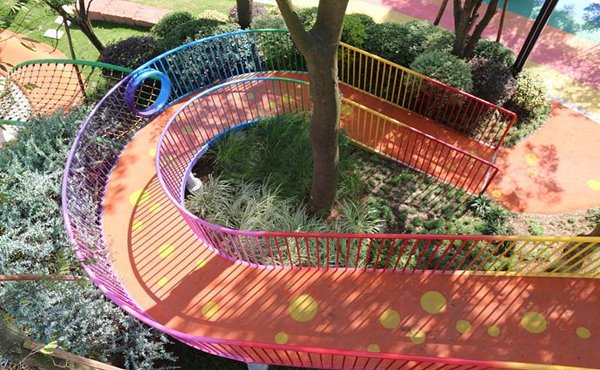 红石儿童公园属于一个高端社区内的一个户外儿童乐园,处于社区的核心中心。游乐园设计的最大亮点就是有一座环绕着大树的彩虹滑梯。滑梯有两条不同滑行体验的滑道,一个是透明的,另一个则是具有挑战速度和高度的全封闭式滑道。滑道根据不同的高度设计了不同的拐弯点和滑梯加速度,体验感非常强,滑道末端连接着沙池可以安全的接住孩子们。游乐园另一个设计特点就是结合场地高差设计了许多攀爬设施满足大龄儿童的玩乐。孩子和父母攀爬至顶端后可以牵手一起滑落,亲子氛围感满满,体现出设计师“增加亲密、陪伴”的设计理念。