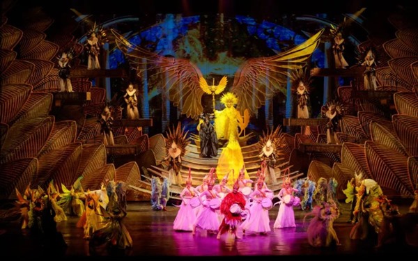 旅游景区主题剧场向来是艺术创新的先锋领域,为了吸引游客,需要“因剧制宜”的创新性设计,往往都有一套独有的舞台机械设备。如《O》剧场的舞台是一个圆形的深水池,其中设置了大量升降机械和特效设备,为观众呈现了一场具有视觉震撼力的水上杂技秀。佛罗里达州的《NOUBA》剧院的舞台设置了一个大型的蹦床,给人留下深刻印象。另外还可以借助声光电系统进行创新设计。如北京欢乐谷的华侨城大剧院在观众席的上方专门设计有两个可以升降、可以调节入射角度的面光源,突破传统的灯光设计无法满足的特殊需求。