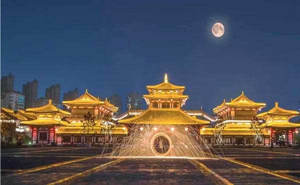 城市公园不仅要满足城市居民的日常生活需求,同时也要传递城市的文化和特色。上阳宫文化公园作为具有浓厚历史,存在历史遗迹的特殊城市公园更需要如此,在文化的主题展现及表达上都需要体现出当地文化的意境。上阳宫作为盛唐时期的皇家公园,具有苑囿和宫廷的双重功能。设计团队立足于盛唐文化,并从中提取历史文化素材进行创意设计,打造出公园特色的景观,形成带有盛唐文化基因的文化意境。如公园内的铺装图样及灯饰等,都依据盛唐时期的造型特点设计。因唐代还是佛教盛行的朝代,公园中还体现出佛文化的元素,有藏传佛教喇嘛塔及经文等的表达。公园中的雕塑也如此,如唐仕女铜雕塑等。这些文化主题的表达让上阳宫文化公园独具特色,为城市居民的生活赋予了特殊的时代意义,成为现代城市公园文化设计表达的典范。