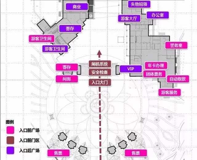 前广场区域需设置散客售票点、团客售票点及游客服务中心。