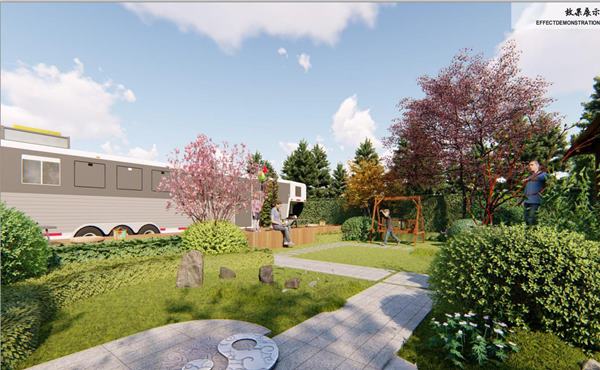 在房车的营位设计上有单房车营位和双房车营位。单房车营地内部设计有木平台、秋千、草坪、沙坑和景观亭等。木平台主要为游客提供进食、喝茶的需求,秋千草坪有功能上体验和视觉观赏的作用,大人们可以在景观亭中进行休憩和互动交流,设计上确保一定的私密性,形态上采用了道家八卦图的元素。绿植和道路的曲线形态是由云和水的特点来进行艺术化提炼,体现出环境的特色性。双方车营地设计在很大程度上保留了空闲的区域为游客提供自由活动的空间,并通过绿植设计来确保空间的私密性。